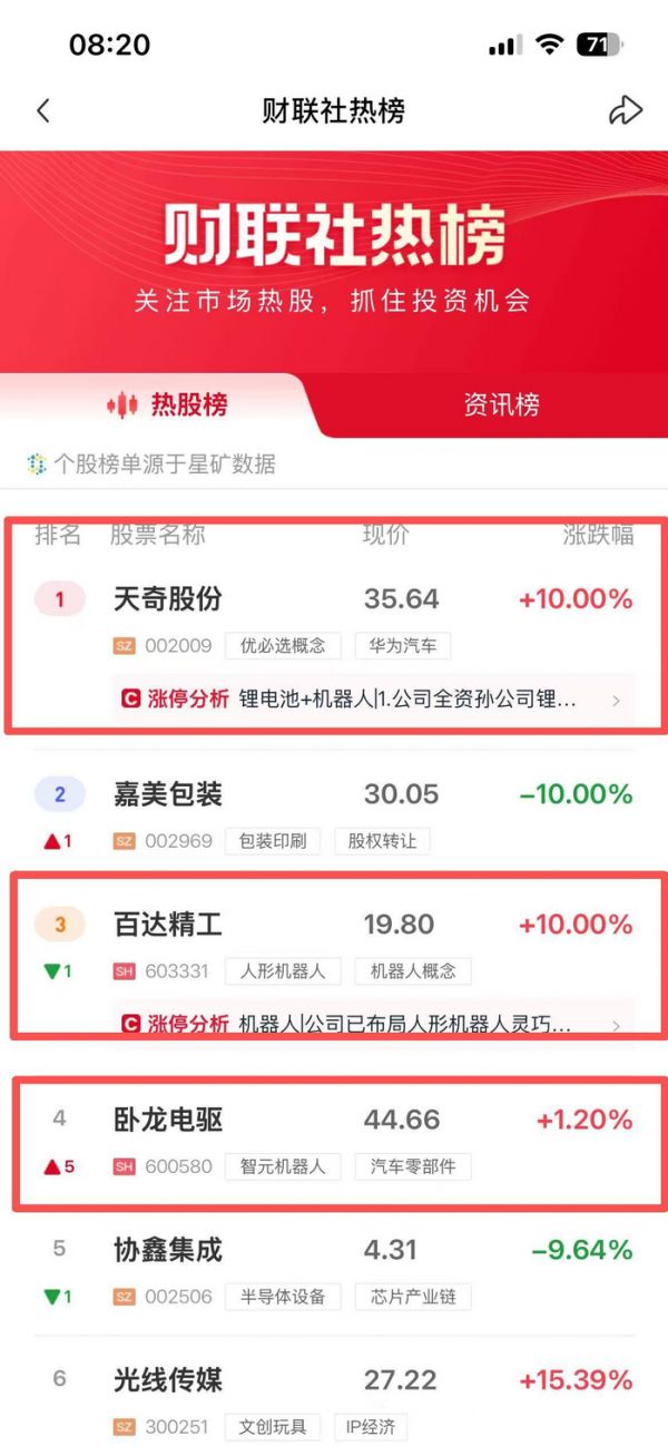 一直以来,财联社热股榜是股民朋友观察短线投资机会的重要窗口。记者浏览该榜发现,前五排名中,机器人占据三席,机器人妥妥的C位,其中天奇股份位列第一,百达精工位列第三,卧龙电驱位列第四。