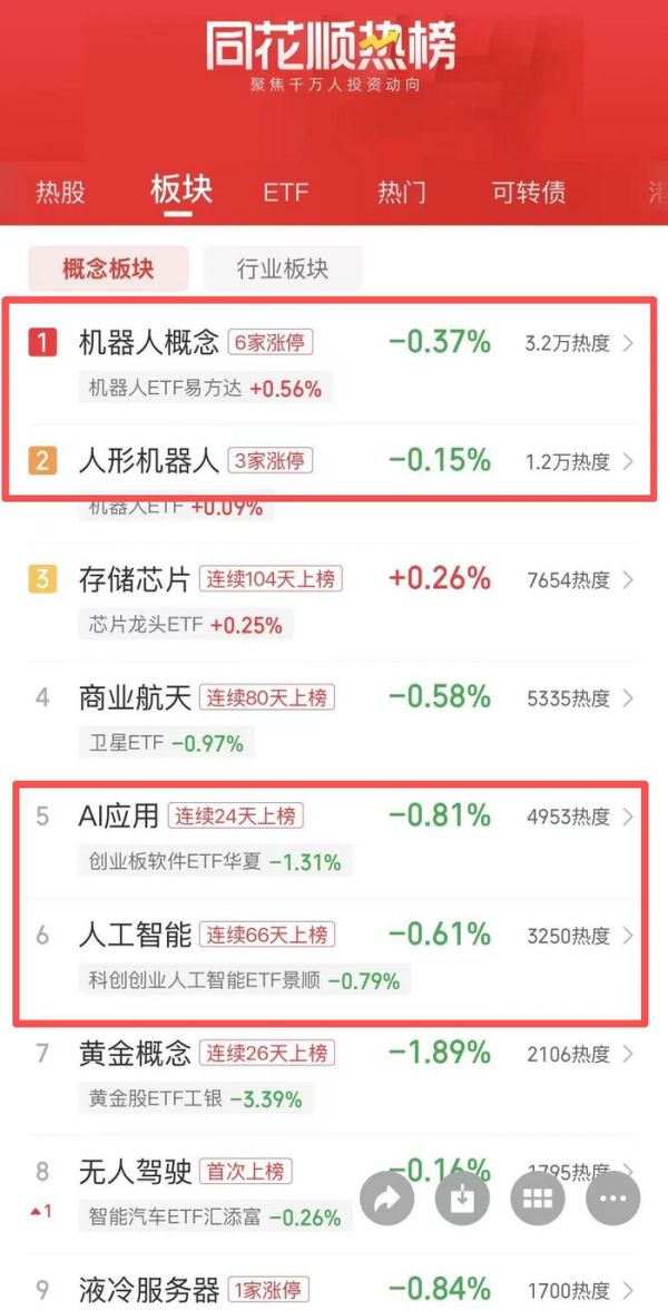 无独有偶,在同花顺热榜,“机器人概念”“人形机器人”分列榜首和榜二,“AI应用”“人工智能”分列第五和第六。其中机器人有6家涨停,人形机器人有3家涨停,显示聪明的资金先知先觉,已经抢先潜伏挖掘机器人天团扎堆春晚的投资价值。