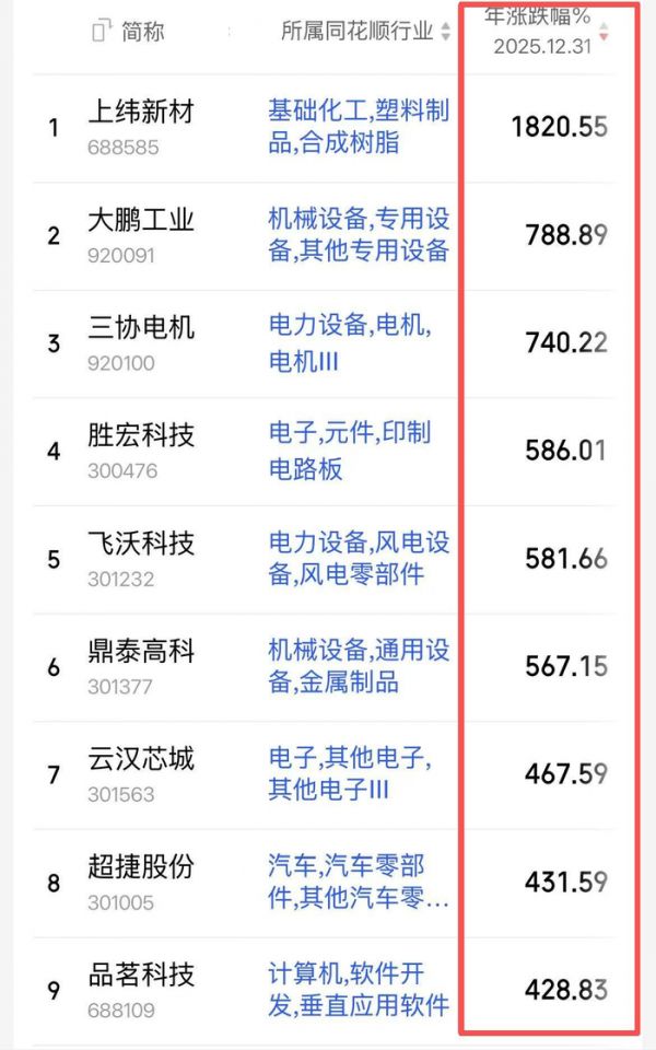 其次看板块里有代表性的个股,俗话说:概念搭台,个股唱戏,刚刚过去的2025年,机器人板块诞生了不少翻倍牛股,按自然年度涨幅排名,上纬新材涨1820%位列榜首,第二名至第十名分别为大鹏工业(788.89%)、三协电机(740.22%)、胜宏科技(586.01%)、飞沃科技(581.66%)、鼎泰高科(567.15%)、云汉芯城(467.59%)、超捷股份(431.59%)、品茗科技(431.59%)和浙江荣泰(419.05%)