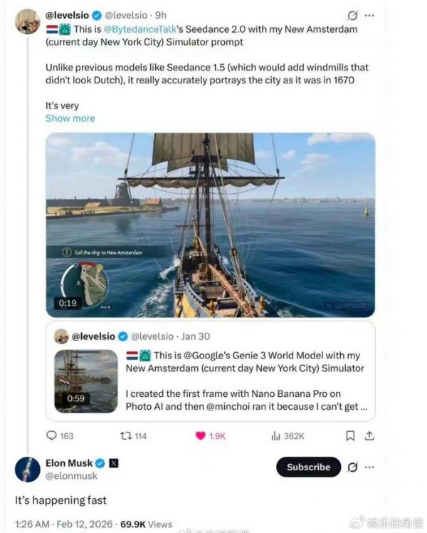 “It's happening fast(发展速度太快)”2月12日,马斯克在社交平台发出这样的感慨,他说的正是字节跳动视频模型Seedance 2.0。