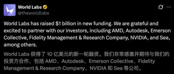 就在刚刚,李飞飞「明星初创」World Labs官宣:成功斩获高达10亿美元的全新一轮融资。