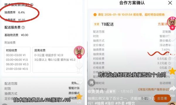 近日,多地外卖商家晒出与淘宝闪购的新合同,称平台佣金再度上涨。如河北某商家@煲煲鸡 在抖音发视频吐槽,新合同的抽佣比例从6.4%上涨至7.4%。据他所言:"淘宝闪购要求商家必须在24小时之内签署,不签署将自动执行"。另有商家在其评论区指出:不签约商家的店铺将被直接下线。