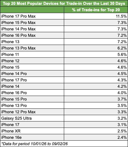 iPhone 15 Pro Max 和 iPhone 14 Pro Max 依旧表现突出,各占以旧换新总量的约 7.3%;iPhone 16 Pro Max 和 iPhone 13 则各占 7.2%。前 20 名设备合计约占所有以旧换新活动的 47%。