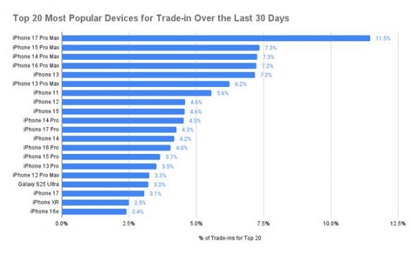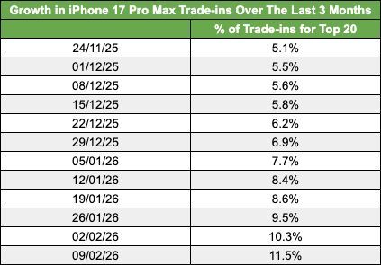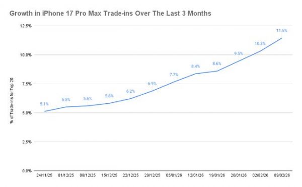 IT之家注意到,iPhone 17 Pro Max 在以旧换新前 20 榜单中的占比,从 11 月下旬的约 5.1% 升至 2 月初的 11.5%,在大约 12 周内实现翻倍。86% 的以旧换新设备被评定为全新或良好状态,这表明不少用户在购买后不久便将其出售。