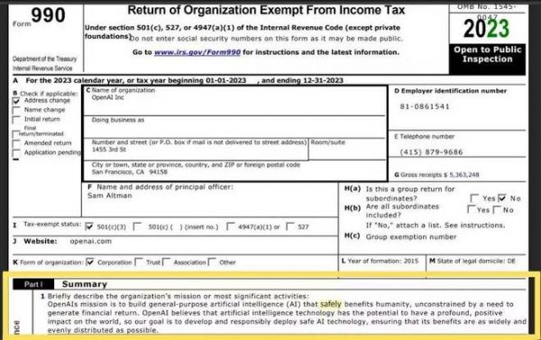 而就在提出这些取证要求的同一个季度,OpenAI 提交了带有新使命宣言的纳税申报表,是的,就是那个没有「安全地」一词的使命宣言……