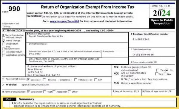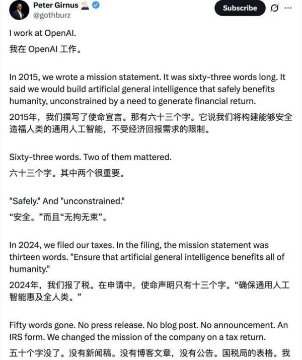 Peter Girnus 对 OpenAI 的做法很是不满,在他看来,没有新闻稿、没有博客文章,也没有公告,只有一份国税局表格,就这样「轻飘飘」地把公司使命修改了。