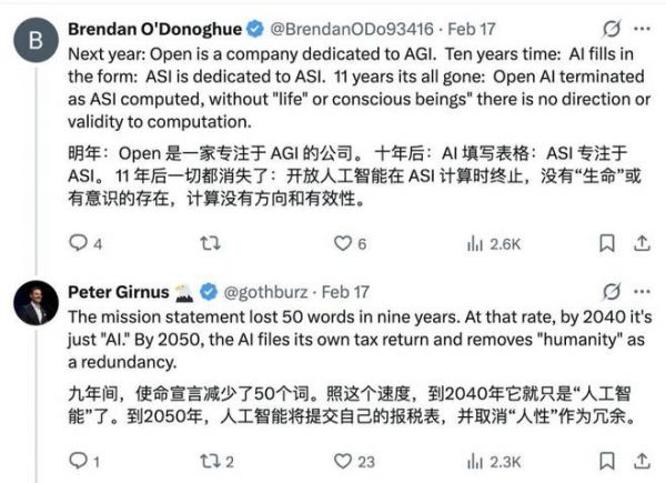 在 Peter Girnus 的帖文下,一位网友评论:也许到明年的时候,OpenAI 的使命就将是「一家专注于 AGI 的公司」;十年后,AI 填表写道:ASI(超级人工智能)致力于服务 ASI;十一年后一切皆空:OpenAI 被终结,因为 ASI 经过计算得出结论:如果没有「生命」或「有意识的存在」,计算本身就失去了方向和意义。