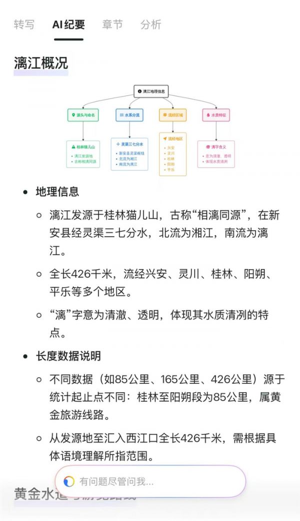 除了录音外,钉钉A1 Lite还自动根据导游介绍,将漓江的源头与命名、水系分流等生成了思维导图,在游玩了一天之后,回去翻看照片时,那些关于漓江的历史与知识还历历在目,不至于“回到家什么都忘掉”。