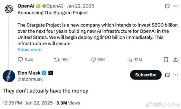 5000亿“星际之门”?马斯克:OpenAI没钱,软银也就不到100亿美元