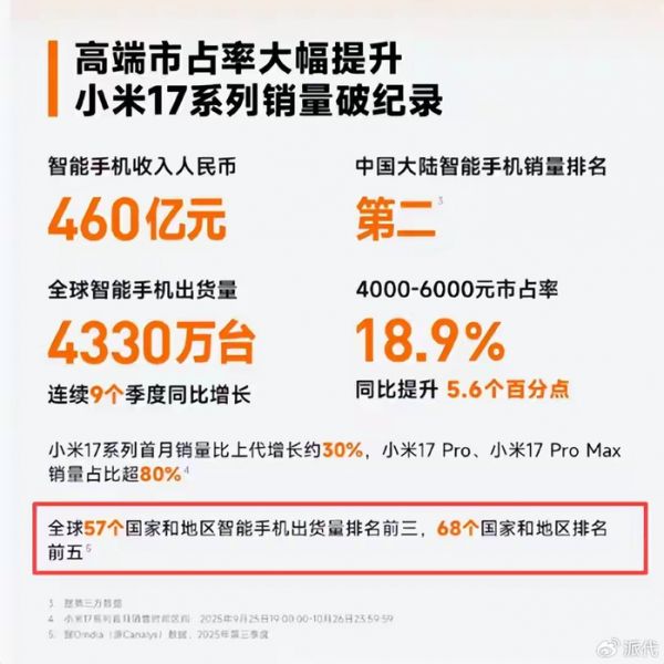 此前,凭借Redmi系列等产品高性价比,小米在新兴市场快速起量,2025年Q3数据显示,小米在全球57个国家和地区的手机市场排名前三,68个国家和地区排名前五。