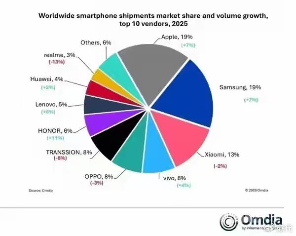 先来看一组数据,2025年全球智能手机前十大厂商市场份额排名:苹果19%、三星19%、小米13%、vivo 8%、OPPO 8%、传音8%、荣耀6%、联想5%、华为4%、realme 3%。