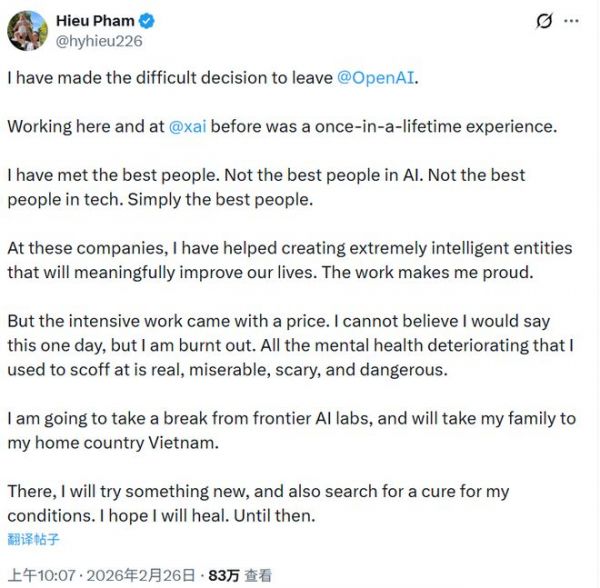他表示,将暂别前沿AI实验室,带着家人回到越南,寻求疗愈。这封言辞克制却震动人心的声明,将AI行业的过劳问题推至公众视野的中心,也在AI从业者圈子中引发广泛共鸣。