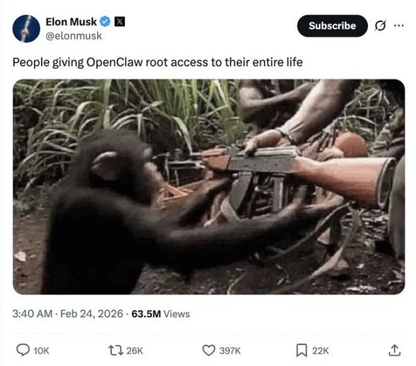 本周一,马斯克在社交平台X上转发了一张带有强烈讽刺意味的图片:一只懵懂的猴子,正接过人类递来的自动步枪。