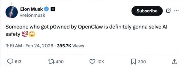 马斯克见状,迅速补上了致命一击:“一个被OpenClaw彻底玩弄(p0wned)的人,居然还想解决AI安全问题?”