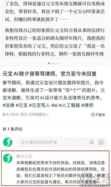此事在发酵后,腾讯元宝方面也进行了道歉,“非常抱歉给您带来不好的体验。经核实,该情况是由模型在处理多轮对话时输出的异常结果导致。目前,我们已紧急校正了相关问题并优化体验。感谢大家对元宝的监督与建议,再次向您郑重致歉!”