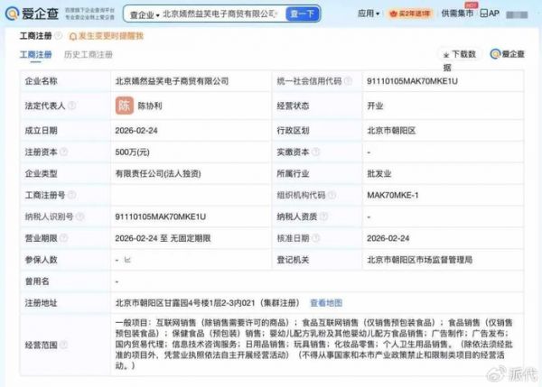 爱企查显示,由其间接全资持股的“北京嫣然益笑电子商贸有限公司”正式注册成立,法定代表人陈协利,注册资本500万元,经营范围锁定互联网销售和婴幼儿配方食品。