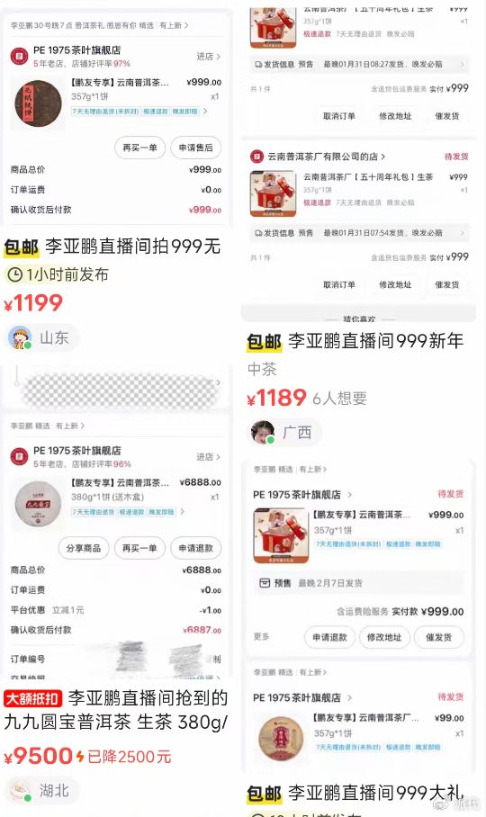就在医院陷入困境之际,李亚鹏的直播带货突然爆发。1月23日“年货茶礼”专场,场观2418万、销售额近亿、单日涨粉73.7万,6888元普洱茶饼被抢到断货。