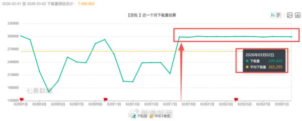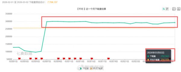 而在2月2日千问公布“春节请客计划”后,千问App五日后日下载量迅速提升至约29.90万,较官宣当日的12.98万下载量提升约130.35%。至3月2日,千问日下载量仍维持在29.29万水平,较官宣当日提升约125.66%。