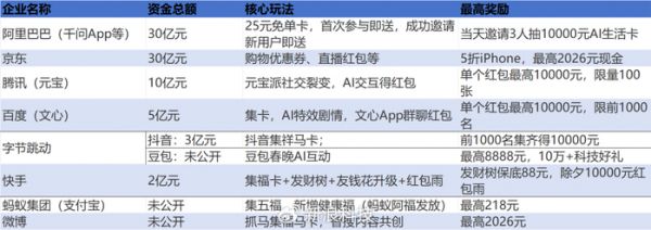据《BUG》栏目不完全统计,今年春节,参加“红包大战”的企业中,公开红包投放金额的企业累计金额超80亿元,若加上字节跳动、支付宝等并未明确公布金额的厂商,今年红包大战累计投入资金或达100亿元。其中,尤以字节跳动豆包、阿里巴巴千问、腾讯元宝三家组成的“千元豆”AI红包军团出手最为阔绰,合计发出超40亿元红包。
