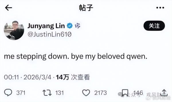 3月4日凌晨,阿里千问技术负责人林俊旸,在社交平台平静地写下“正式离职”四个字。