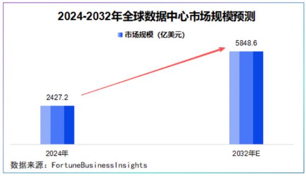行业预测,全球数据中心市场规模将由2024年的2427.2亿美元增长到2032年的5848.6亿美元,年均复合增长率达11.62%。