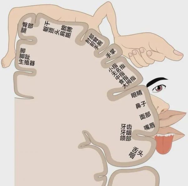皮层小人示意图。1930 年代,加拿大神经外科医生怀尔德·彭菲尔德(Wilder Penfield)在清醒癫痫患者的开颅手术,用电刺激大脑皮层记录患者反应,绘制出来大脑的运动皮层和感觉皮层的功能地图。