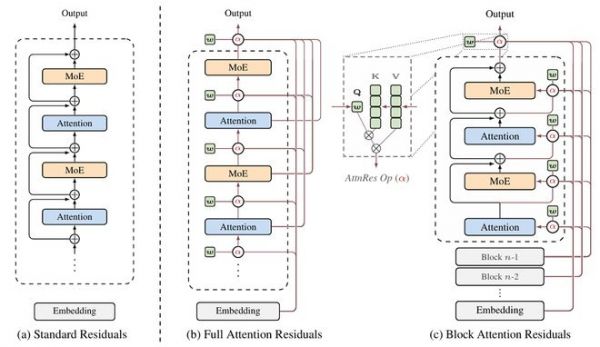 智东西3月16日报道,今天,月之暗面发布论文,提前预览了下一代模型的关键模块——注意力残差(Attention Residuals,简称AttnRes)。论文的核心亮点在于对大模型中最基础、但长期被忽视的结构——残差连接(Residual Connection)进行了重新设计。