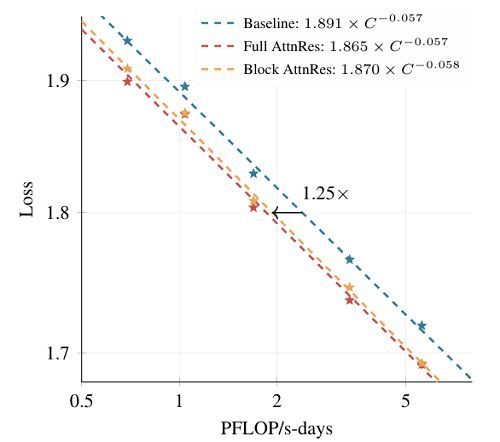 此外,Block AttnRes的验证损失为1.692,而基线为1.714,相当于约1.25倍的计算效率优势。
