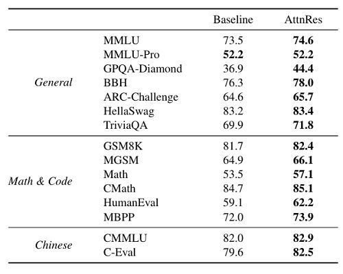 在相同计算预算下,引入AttnRes的模型在多个基准测试中均取得稳定提升,尤其是在数学推理、科学问答以及代码生成等需要复杂推理能力的任务上。