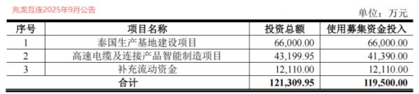 2025年9月,兆龙互连发布募集说明书,拟募集不超11.95亿,用于泰国生产基地、高速电缆及连接产品项目的建设,同时补充流动资金。