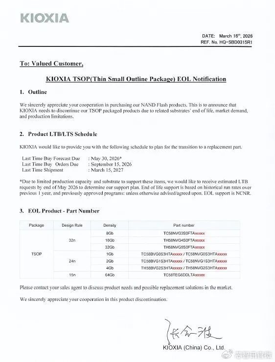 铠侠表示,由于生产能力和基材限制,公司无法生产8Gb-64Gb的TSOP封装产品。希望收到最后采购预测(即客户最后一次下单数量)期限为2026年5月30日,以确定铠侠的支持计划。最后采购订单截止日为2026年9月15日,最后出货时间为2027年3月15日。