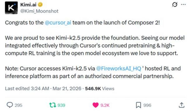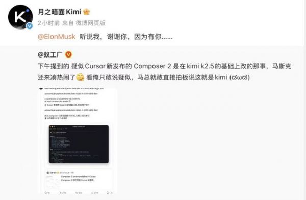 3月21日凌晨3点左右,Kimi官方账号在X平台发布声明:“祝贺Cursor团队发布Composer 2。我们很自豪看到Kimi K2.5提供了基础。看到我们的模型通过Cursor的持续预训练和高算力强化学习被有效整合,这正是我们乐于支持的开源模型生态。”