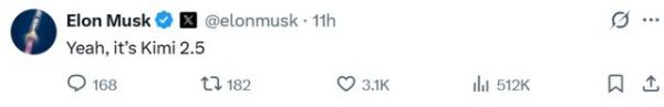 马斯克本人在这条X下面回复说“对,它就是Kimi K2.5”。