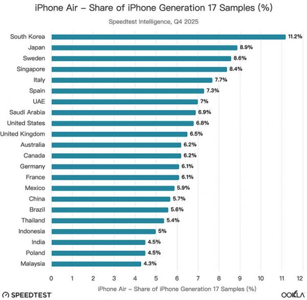 根据Speedtest的数据,iPhone Air普及率最高的前3个国家是韩国(11.2%)、日本(8.9%)和瑞典(8.6%),在美国的普及率仅有6.8%,表现甚至不如意大利(7.7%)、西班牙(7.3%)等欧洲国家。而在中国,普及率只有5.7%,已经属于后排了。