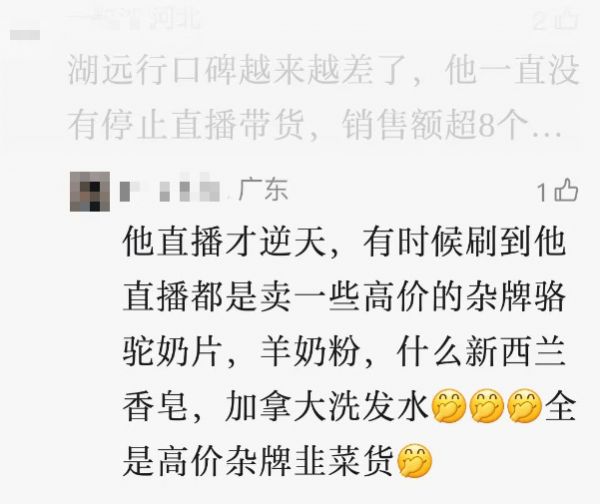 关注他直播的人,可能又会觉得小雷说的不一样,有网友留言说,湖远行现在口碑越来越差了,他一直没有停止直播带货,而且带的都是一些高价的杂牌骆驼奶片,羊奶粉,什么新西兰香皂,加拿大洗发水等等,通俗来讲就是割高价韭菜,对他感官比较差。