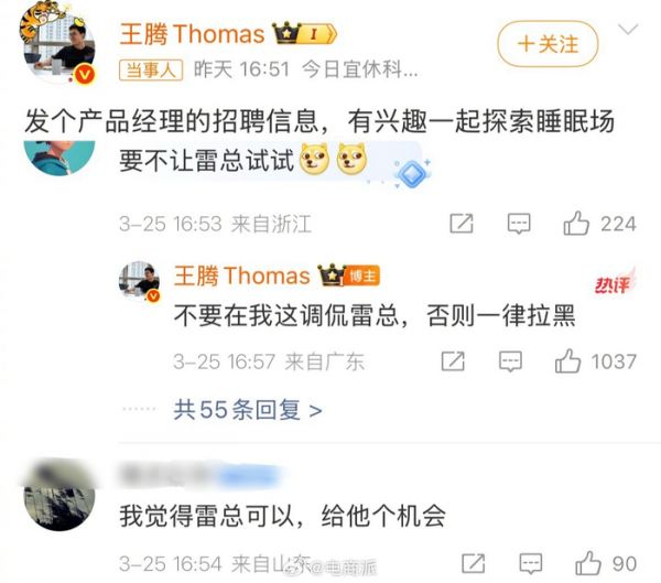 王腾警告调侃雷军者一律拉黑,离职后仍维护老领导