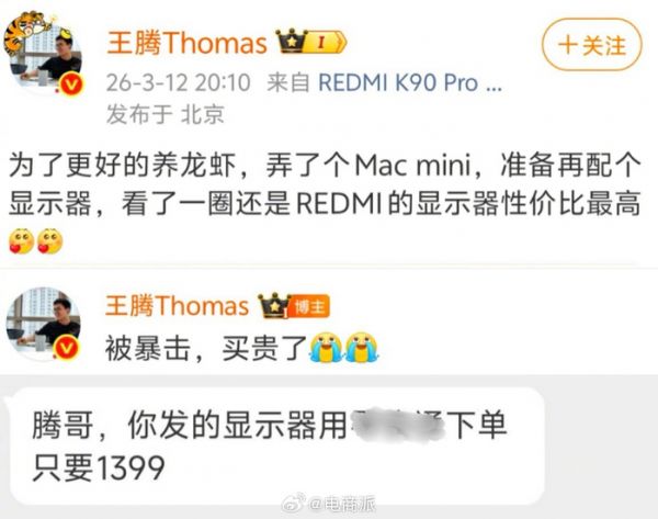 #王腾警告调侃雷军一律拉黑# 王腾回怼调侃雷军的网友,之前图性价比买红米被暴击,自嘲买贵了,网友:还是忘不了小米。
