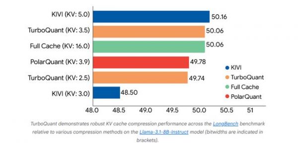 上图展示了TurboQuant、PolarQuant 和KIVI基线算法在问答、代码生成和摘要等不同任务中的综合性能得分。