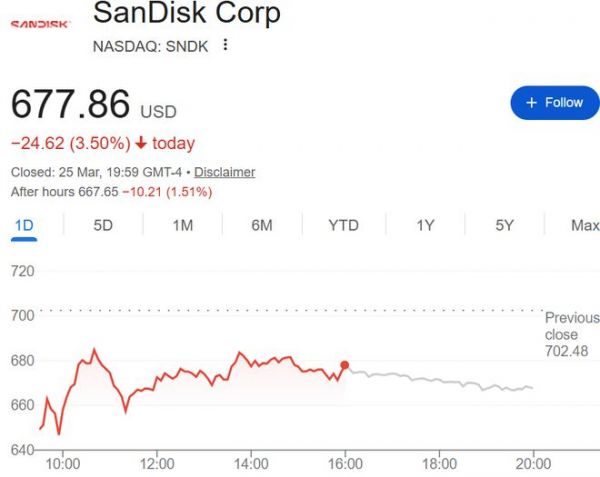 闪迪周三早盘一度大跌