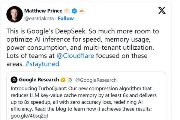 Cloudflare首席执行官Matthew Prince等人甚至称之为谷歌的DeepSeek时刻,认为其有望像DeepSeek一样,通过极高的效率收益大幅拉低AI的运行成本,同时在结果上保持竞争力。