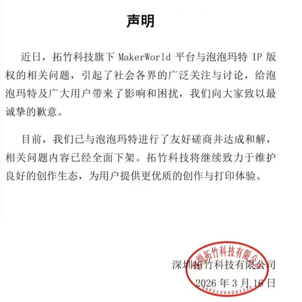 近期,国内消费级3D打印头部企业拓竹科技,正式官宣与潮玩巨头泡泡玛特达成IP版权纠纷和解,旗下MakerWorld模型平台内,所有涉嫌侵权的泡泡玛特IP模型全面下架,拓竹也公开发布致歉声明。