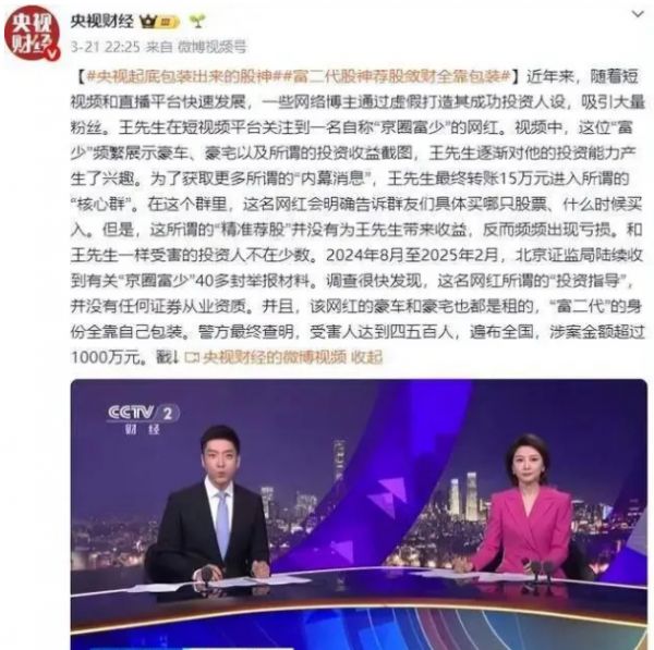 知名网红被央视点名批评,行为太过恶劣,足足用9分钟片段报道,近日,围绕网红“暴富神话”的一则案例引发广泛关注。央视用长达9分钟的深度报道,揭开了所谓“京圈富少”王政源的真实面目,豪车、豪宅、投资实力,几乎全部是包装出来的幻象,而随着判决结果落地,这场精心编织的“财富剧本”也终于画上句号。