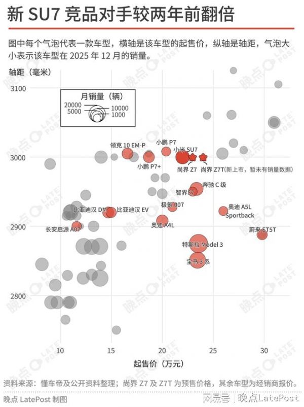但在改款 SU7 发布的一周内,启境 GT7、尚界 Z7 及其猎装版 Z7T 在内的多款 “7” 系新车亮相,它们造型相似、价格相当。根据我们的不完全统计,SU7 在这个价格段的直接竞品数量相比两年前翻倍不止,车型名字里不少都带 “7”。