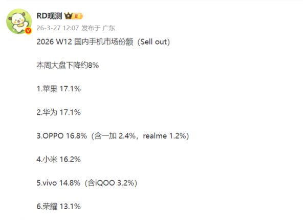 3月27日行业人士“RD观测”就提供了2026年W12周国内排名数据,根据他提供的数据这一周苹果重新回到国内第一的位置,市场份额为17.1%;华为变成排名第二的品牌,市场份额也是17.1%。现实中应该是苹果的销量稍稍高于华为,否则不可能把苹果排在第一位。OPPO还是排名第三的品牌,市场份额为16.8%,其中OPPO占比13.2%;一加占比2.4%;realme占比1.2%。需要说明的是这一周一加的份额下跌了,realme的份额倒是增加了0.1个百分点;小米排名第四位,市场份额为16.2%;vivo排名第五位,市场份额为14.8%,其中vivo占比11.6%,iQOO占比3.2%;荣耀还是排名第六的品牌,市场份额为13.1%。