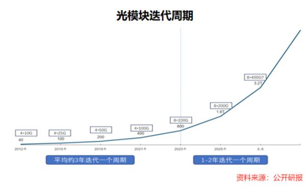 2023年之后,AI技术蓬勃发展,其对计算能力的需求远超传统通用计算,光通信产品需求激增,迭代周期直接由约3年提速至1-2年。
