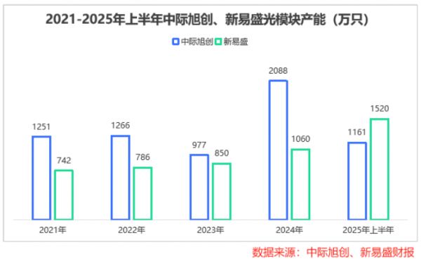 2021到2024年,新易盛光模块产能始终低于中际旭创,而2025年上半年其产能达1520万只,一举实现反超。