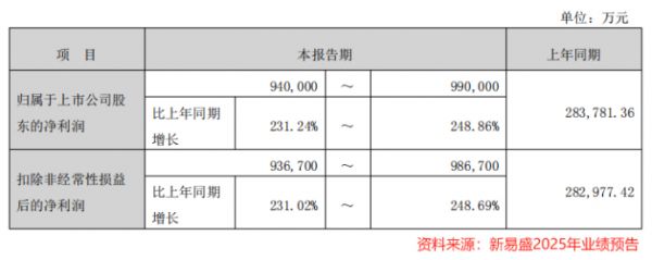 根据业绩预告,新易盛预计2025年净利润为94亿元-99亿元,同比增速最高可达248.86%。
