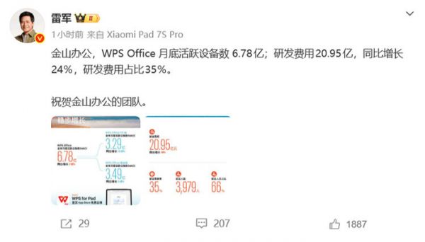 今日雷军在社交平台发文,称:金山办公WPS Office月底活跃设备数达到6.78亿,研发费用20.95亿,同比增长24%,研发费用占比达到35%,祝贺金山办公的团队!