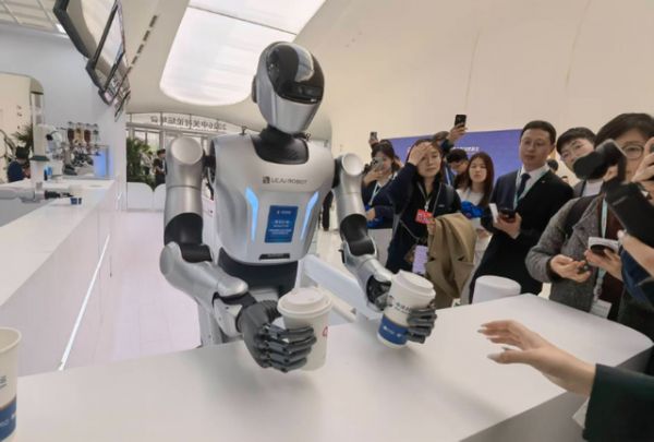 3月25日,2026中关村论坛年会现场,机器人将制作完成的饮品递给观众。(新华网 底东娜 摄)看上去忙忙碌碌相互配合的餐吧,实则也是各个厂商机器人展现各自灵巧手技术实力的“无声擂台”。