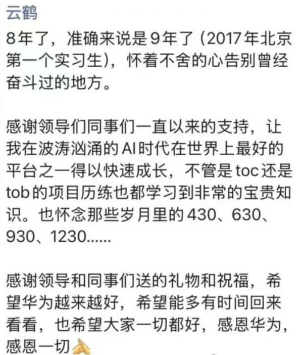 字里行间全是怀念,连 “430、630、930、1230” 这些加班时刻都拎出来了,最后一句 “感恩华为”,看得人鼻子一酸。